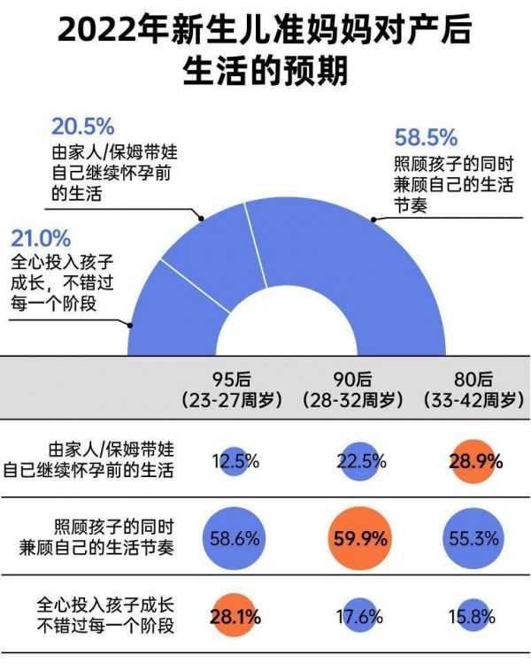 新生代父母越来越多由曾经作为家庭核心的独生子女一代组成。根据美柚和MobTech发布的报告显示,2021年妈妈人群中“95后”占比显著上升,由2020的13.9%上升至2021年16.2%。未来5年,“95后”到“00后”之间的人群年龄将从21~26岁,上升至26~31岁,将逐渐取代“85后”成为育儿的新生力军。