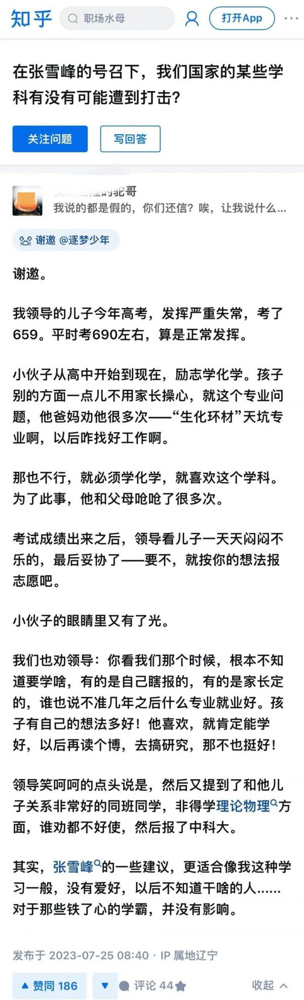 那么知乎问答中的这两个孩子,即老总的儿子,以及老总儿子的朋友,他们笃定地选择自己喜欢的专业,他们错了吗?他们掉到坑里了吗?选择了张雪峰建议的那些热门专业的穷人家的孩子将来就可以吊打这两个孩子吗?