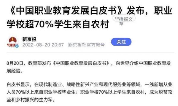 再看看农村孩子。2022年8月在世界职业技术教育发展大会期间教育部发布的《中国职业教育发展报告(2012~2022年)》说道:“职业学校70%以上的学生来自农村,‘职教一人,就业一人,脱贫一家’成为阻断贫困代际传递见效最快的方式,在中国开展脱贫攻坚、全面建成小康社会中发挥了重要作用。”