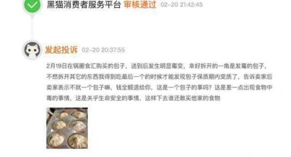 有消费者反馈,此前在锅圈食汇购买的包子,送到后发现明显霉变,当其向卖家反馈后,卖家反应十分冷淡,直言可以全额退款。但是消费者坚持认为,这是食品安全的大事,并不是简单的敷衍态度、退款处理就足以从根源解决的。