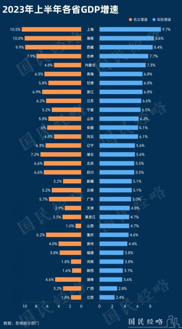 从实际GDP增速来看,上海、海南、西藏、吉林遥遥领先,部分中西部省份不及预期,远远跑输大盘。
