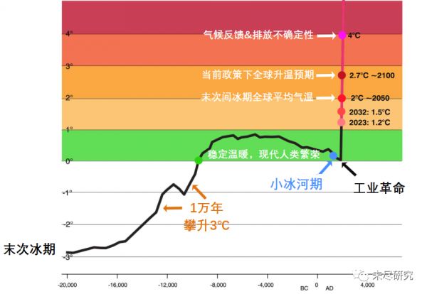 从工业革命以来,地球气温差不多上升了1.2℃,如果不调整政策,到2100年,地球将升温2.7℃,如果叠加大自然的反馈与更多不确定性因素,甚至有可能升温4℃。