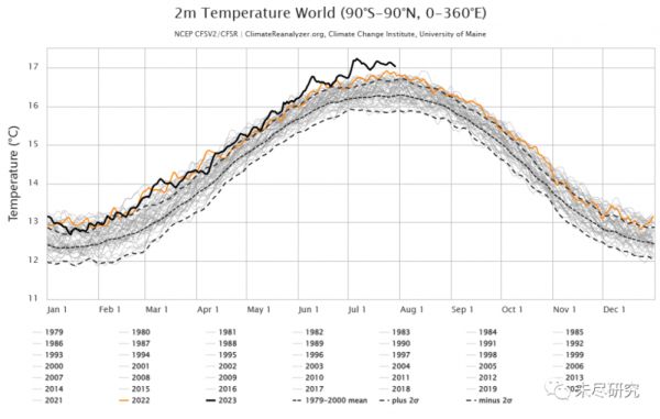 从今年6月开始,全球“每日地表2米气温”就已经脱缰而上,超越了2022年,也超越了之前被视为历史最热的2016年。