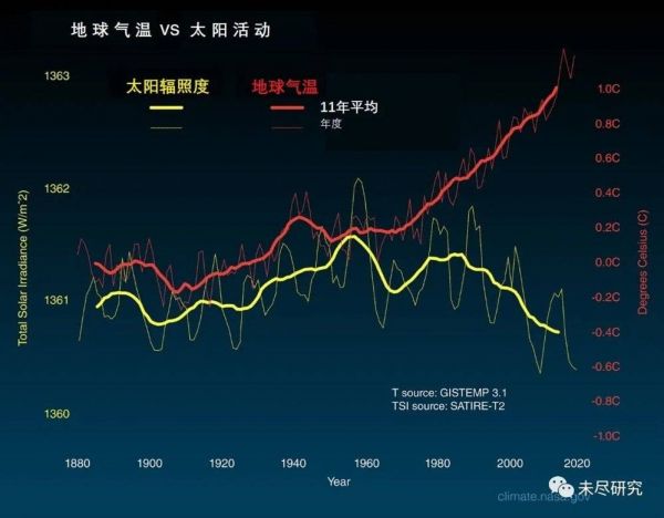 来源:NASA。说明:自20世纪50年代以来,地球接收的太阳能量一直遵循太阳的自然11年周期轻微波动,但总体没有增加。在同一时期,全球温度显著上升。因此,太阳辐射变化极不可能是过去半个世纪观察到的全球变暖趋势的原因。