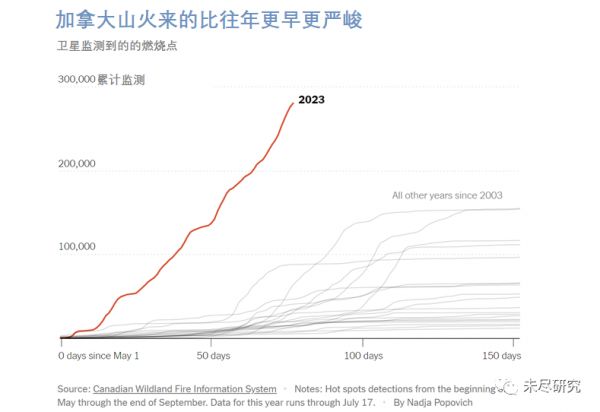 来源:CWFIS。说明:加拿大山火往往从5月开始,持续到10月。横轴为距离5月1日的时间,截至7月17日数据。