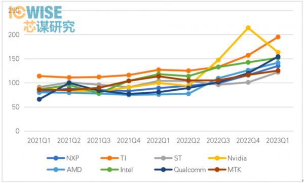 图1:国际半导体龙头每季度库存(2021Q1-2023Q1)
