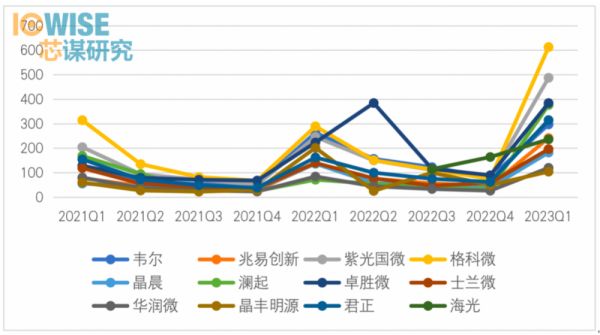 受2022年上半年上海疫情影响,产品交付不顺畅,当时库存达到相对高位。随着疫情的逐渐平息,库存逐步回落。但2022下半年全国经济下滑明显,对芯片的需求急剧下滑,又导致2023Q1库存暴增,很多公司的库存甚至超过了疫情期间,以低端CIS为主的格科微的库存增长尤为惊人。这其中也有企业高估疫情放开之后行情恢复力度,备货过多的因素。