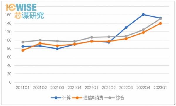 我们把上述多家龙头按领域分为计算、通信&消费、综合(主要是工业和汽车)三大类。观察它们的平均库存,发现综合类的芯片库存竟然一直多于通信&消费类。