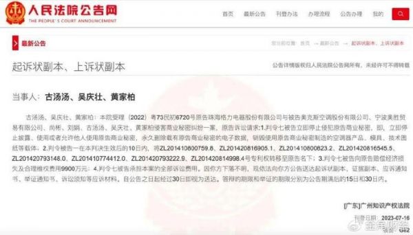 7月16日,人民法院公告网公开信息显示,格力电器控告奥克斯及相关被告侵害其商业秘密,要求判令奥克斯将8项专利权转至其名下,并要求赔偿9900万元。