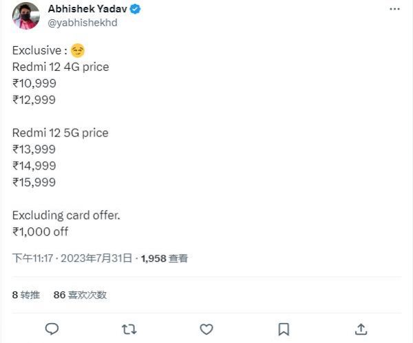据他说说,Redmi 12 4G 分为两个版本,分别为 10,999 卢比和 12999 卢比,而 Redmi 12 5G 分为三种规格,分别为 13999 卢比 14999 卢比 15999 卢比。