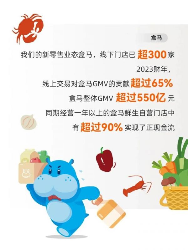 那么盒马具体的业绩表现如何?2023财年,盒马整体GMV超过550亿元,线上交易对盒马GMV的贡献超过65%。