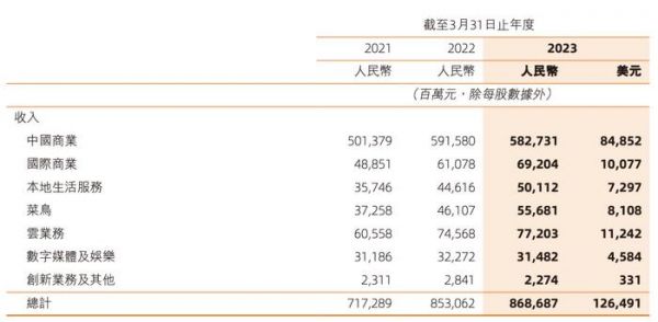 在中国商业(天猫、淘宝、淘菜菜等)方面,财年内收入为5653.32亿元,同比下滑了1.7%,占总收入的65%。