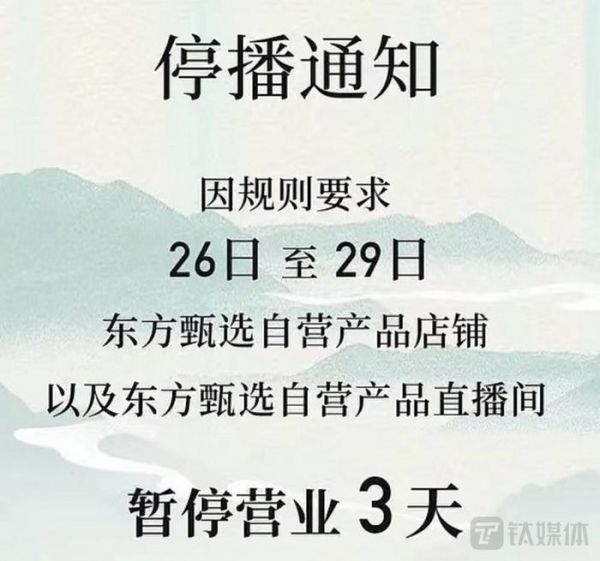 7月26日下午,抖音直播间“东方甄选自营产品”发布停播通知:“因规则要求,26日至29日,东方甄选自营产品店铺以及东方甄选自营产品直播间暂停营业三天”。