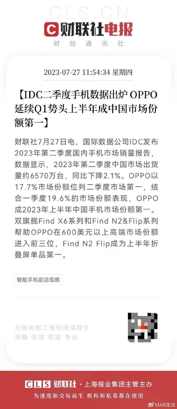 OPPO强势登顶上半年国内出货量冠军,Find N2 Flip成1-5月折叠销冠