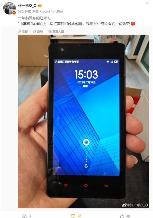 昨天是7月31日,也是红米手机正式面世十周年的日子,很多人都在网上晒出了自己当年抢购的初代红米手机,Redmi手机市场负责人张一帆也不例外,而且他还发文称:十年前发布的红米1,“山寨机”这样的上古词汇离我们越来越远,我想其中应该有它一份功劳。