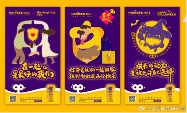 在营销物料上,谷仓提炼产品卖点,并从食材、口感、营养、功能上做区分,满足家长的购买需求;在设计表现上以黄色搭配紫色制造视觉对比,强化品牌印象。