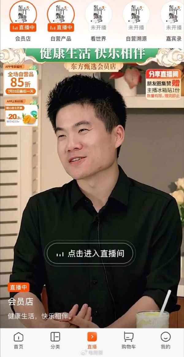 与之相对应是东方甄选APP的热闹景象:4天销售额突破1.1亿,8.5折的自营产品优惠活动在原计划基础上延期2天,过百万客户选择在东方甄选APP下单。