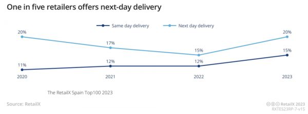 相比之下,只有17%的零售商提供所有订单的免费送货服务,消费电子产品类零售网站(34%)和综合品类零售网站(26%)更倾向于提供免费配送。西班牙零售电商的平均配送时间为7.55天,配送时长中位数为4天。