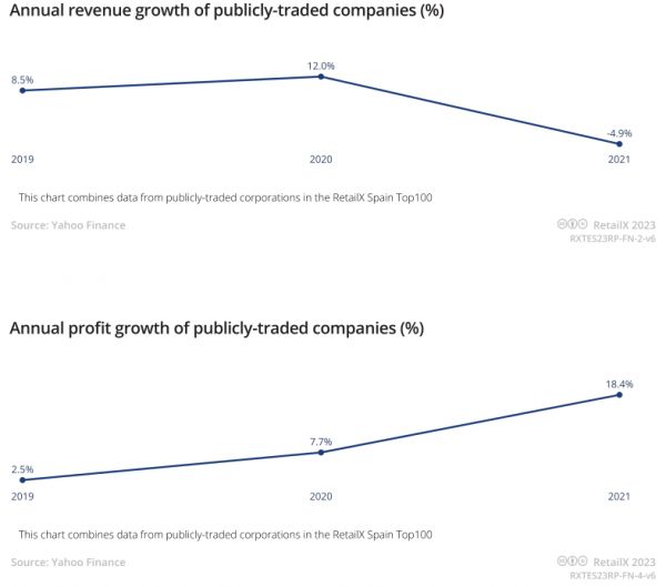 在这一价值链中,RetailX的研究数据来源主要参考榜单中上市公司公布的2019年至2021年的财务业绩,撰写期间,许多零售商还未发布其2022年的业绩情况,因此暂时无法分析。现有数据表明,健康增长的基础之上,西班牙的上市零售企业在2020年的营收也实现了一定程度的提升,随后从2021年的峰值回落,但盈利能力在疫情期间依然有所增强,这一定程度反映出企业降低成本的速度快于营收增长的下滑速度。