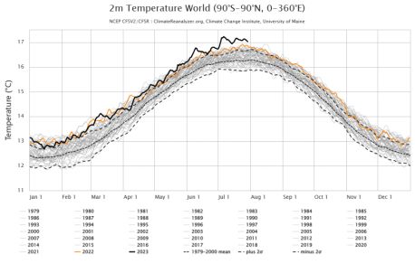 但是情况在5月份发生了变化,缅因州大学气候再分析系统显示,从2023年5月10日开始,2023年的温度就超越了2022年的同期温度;到了6月初,2023年的平均气温已经创历史新高;7月3日,地球表面以上2米的全球平均气温达到17.01℃,成为有记录以来最热的一天,这一记录一直持续到了7月6日,最终创下了17.23℃和超出平均温+1.02℃的记录。如果从六月初算起,这种“最高温”已经断断续续地实现了一个多月。