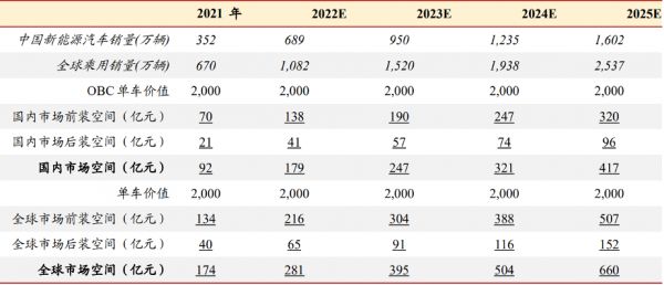 对于每辆新能源汽车,无论是纯电动汽车还是插电混合动力汽车,都需要配备一台OBC。按照每台OBC平均价格 2000 元计算,以及考虑后装替换市场是前装市场的30%,目前行业规模在281亿元。预计到2025年,行业规模可能达到660亿元,2022~2025年复合年增长率(CAGR)为33%。