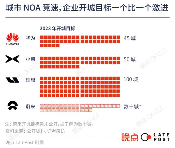 目标一个比一个激进,以今年内为时限——华为宣布要把城市 NOA 推广到 45 个城市,小鹏是 50 个,理想更是把开城竞争带到三位数:100 个。