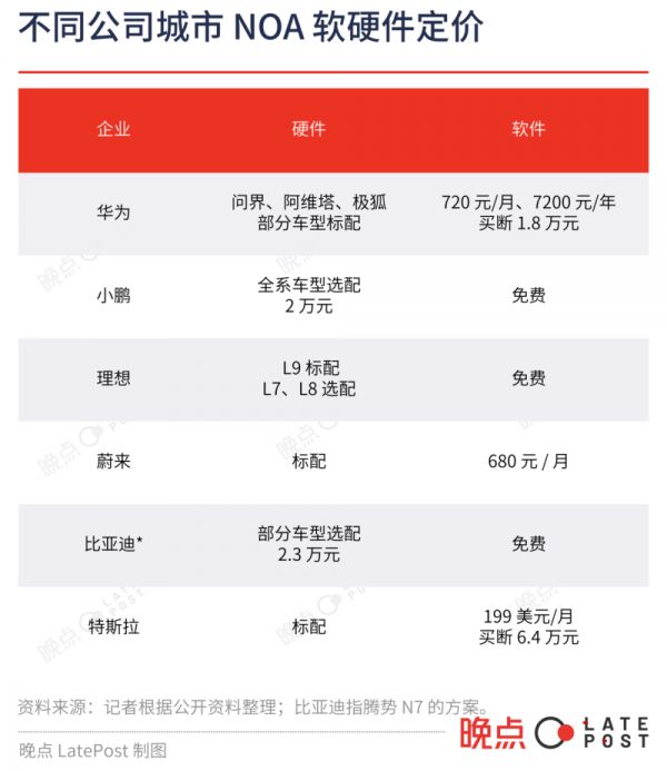 小鹏、理想、比亚迪等车企则通过软件免费,吸引更多人选装配套硬件,尽管它们都组建了数百人,甚至上千人的自动驾驶软件开发团队,但现在暂时不指望像特斯拉那样直接靠软件赚钱。原本软件收费的华为现在也开始降价:今年 6 月,发布支持城市 NOA 的高级辅助驾驶系统 ADS 2.0 两个月后,华为宣布买断价格打五折,从原本的 3.6 万元降到 1.8 万元。