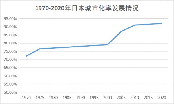 为推动工业化转型发展,从1955年开始日本加速城市化建设,东京、大阪、名古屋的三大都市圈涌入大量农村人口。公开信息显示,1945~1975年30年间,日本城市化率年均增长1.6%,1975年城市化率达到76%,2010年后一直维持在90%以上的高位。