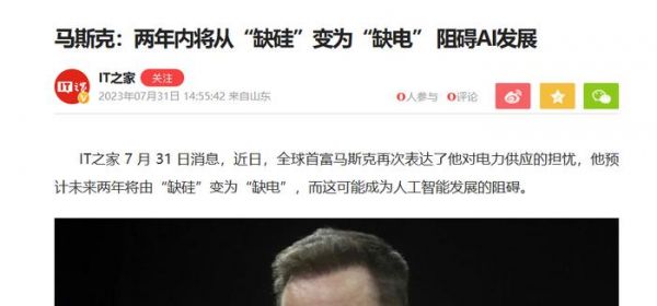 7月31日,马斯克在会议上对能源业高管表示,“我们将从今天的硅短缺变成两年内的电力短缺,缺电可能阻碍AI的发展!”