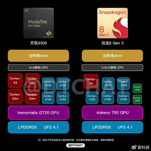 如果仅看纸面参数,天玑9300比骁龙8 Gen 3多了3颗超大核,峰值性能上限会更夸张,极限性能理论上会更有优势。但我们都知道,在手机芯片上,超大核心很难持续以峰值性能输出,日常使用骁龙新品未必会落下风。骁龙8 Gen 3的方案更保守,但也更稳;天玑9300狠命堆料,力图以极限性能来取胜。