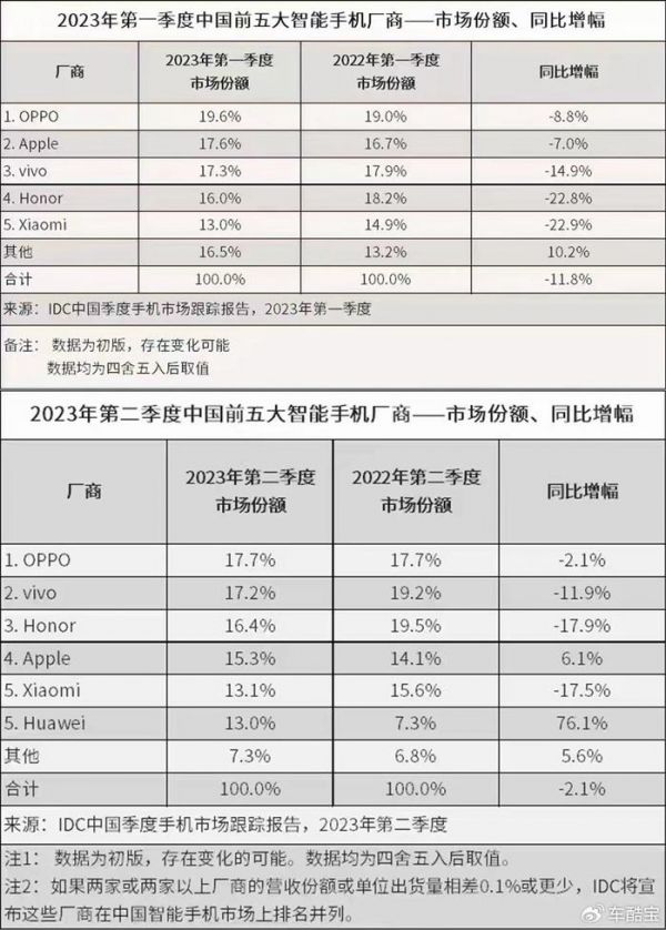 (2023年第一、二季度国内手机市场份额占比,图源IDC)