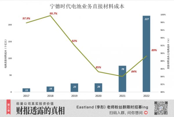 2022年,材料成本空前地达到2267亿,占电池成本的89%(总成本的86.5%)。
