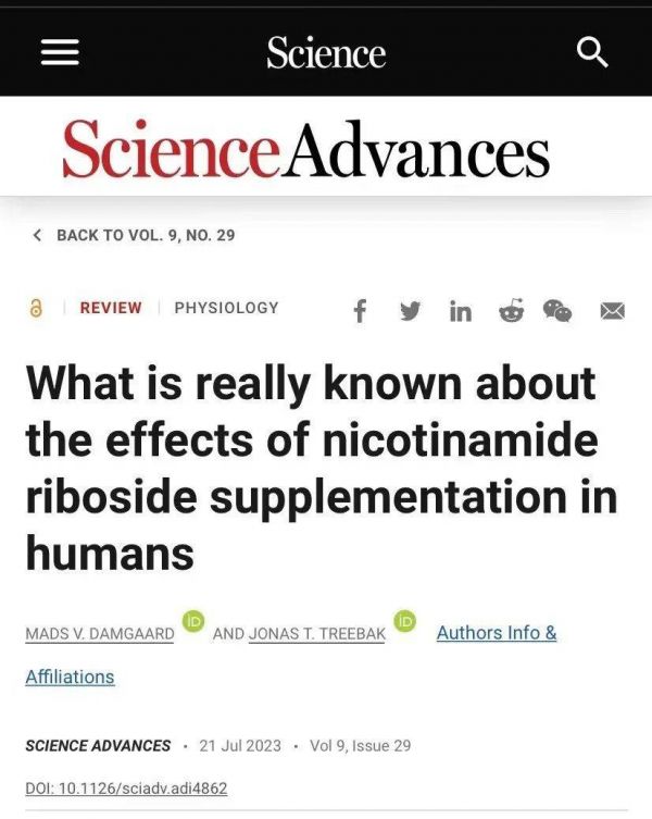 7月底,《科学》子刊《Science Advances》杂志发表了一篇《What is really known about the effects of nicotinamide riboside supplementation in humans》(关于烟酰胺核苷补充剂对人体的真正影响是什么?)的研究文章,来自丹麦哥本哈根大学的两位科学家对2016年以来的25项“NR补充剂”(烟酰胺核苷补充剂)临床试验结果,进行了统一审查,这些临床试验中,甚至包含了这篇文章作者的数项相关临床试验。