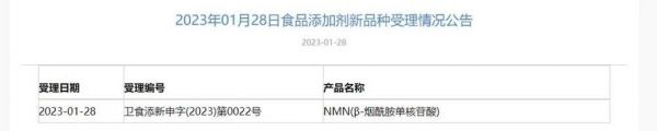 国家卫健委政务服务平台发布了《2023年01月28日食品添加剂新品种受理情况公告》,公告显示,NMN(β-烟酰胺单核苷酸)作为食品添加剂新品种正式获得受理。2022年初,两家企业的NMN作为化妆品新原料备案获得通过的消息,让NMN再次获得市场广泛关注。而此次NMN被申请进入食品添加剂能否顺利获得通过,尚有待观察。