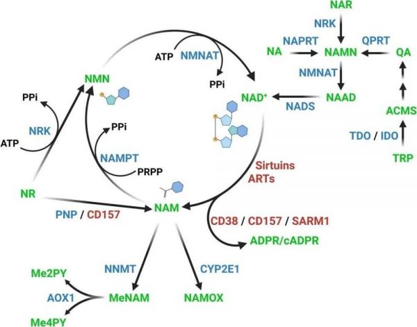 NMN和NR在体内最终都转变成NAD+。随着人体的衰老,体内的NAD+也逐年减少。理论上认为,既然NAD+是很多生理活动所必须的能量分子,如果能补充NMN或NR,就能增加体内NAD+,也许就能适当缓解人体的衰老过程了。