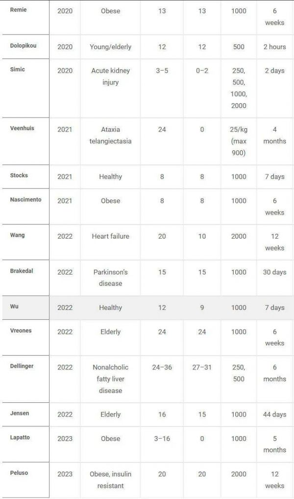 迄今为止规模最大的人类NR试验由Conze等人进行,在100名健康中年参与者中测试了100、300、1000mg/d剂量治疗8周的安全性。结果显示血液NAD+水平剂量依赖性增加,血浆和尿液代谢物增加。但两组间肝肾功能、钾水平、甘油三酯或胆固醇水平无差异,血压和心率也保持不变。