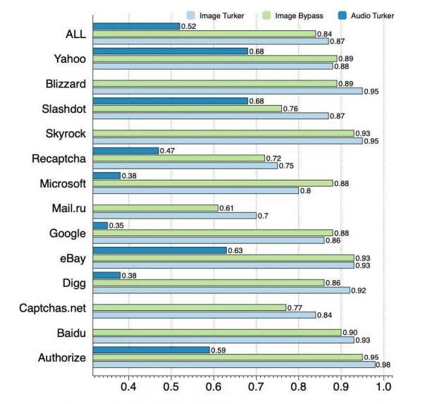 研究人员还发现不同方案的验证码难度存在很大差异,authorize.net 图像验证码是最简单的,而 google.com 音频验证码是最难的。|参考资料[1]