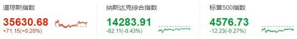 道琼斯指数收于35630.68点,上涨71.15点,涨幅0.20%;标准普尔500指数收于4576.73点,跌幅0.27%;纳斯达克指数收于14283.91点,跌幅0.43%。