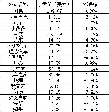 其它热门中概股中,BOSS直聘下跌7.60%,哔哩哔哩下跌6.61%,满帮下跌3.87%,爱奇艺下跌3.47%,百度下跌1.79%,携程下跌1.66%,知乎下跌1.61%,新东方下跌0.14%。
