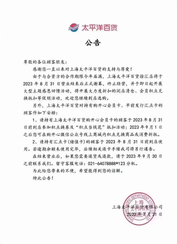 据时尚商业快讯,开业至今已30年的太平洋百货徐汇店日前发布声明,由于与合资方的合作到期,将于8月31日营业结束后正式终止运营,即日起将开展闭店清仓折扣活动。工作人员透露,结束经营主要是因为合约到期,房租没有谈拢。
