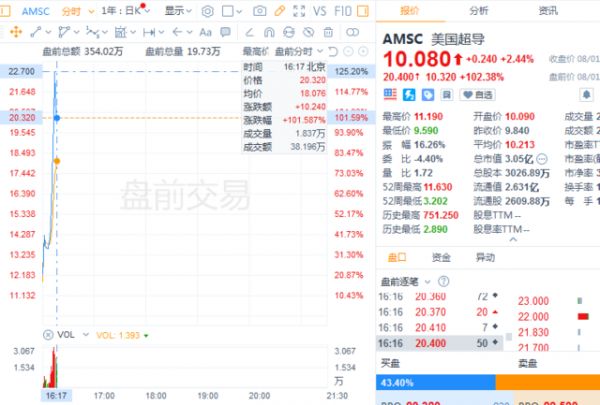 消息传出后,美国超导美股盘前延续涨势,涨幅一度扩大至130%。