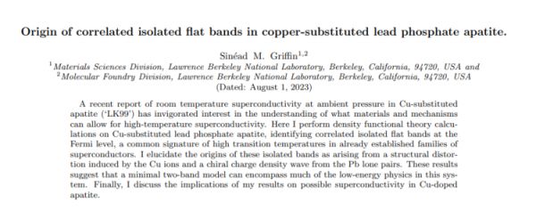 然而,除了复现实验结果外,还有人从理论上支持了LK-99是超导体的可能性。美国劳伦斯伯克利国家实验室的研究院在arXiv发表了一篇论文宣称在LK-99上发现了费米能级的孤立平带——具体原理过于复杂就不解释了,只需要知道他是超导晶体所具有的特性标志就行。