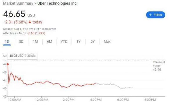 财报公布后,Uber股价周二当天低开低走,午盘跌幅曾接近7%,收跌约5.7%,在周一创两年新高后,回落到7月17日以来收盘低位。