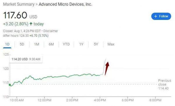 财报公布前,AMD周二收涨2.8%,盘后曾跌约2%,财报公布后,AMD股价在美股盘后拉升,不但迅速转涨,而且盘后曾涨幅扩大到5%以上。