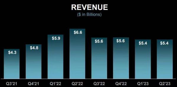 二季度非GAAP口径下调整后营业收入约为53.59亿美元,同比下降18%,同比连降两季,环比大致持平一季度水平,高于公司指引区间的中值53亿美元,也高于分析师预期的53.2亿美元。