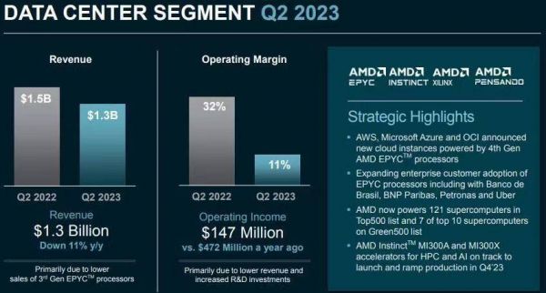 包括CPU、数据中心GPU、Pensando和赛灵思数据中心产品在内,AMD的数据中心事业部二季度营收13亿美元,同比下降11%,环比增长2%,一季度同比小幅增长1.5%。