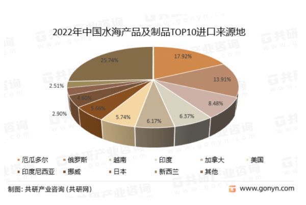 中国进口海产品十大来源地是:厄瓜多尔、俄罗斯、越南、印度、加拿大、美国、印度尼西亚、挪威、日本、新西兰。