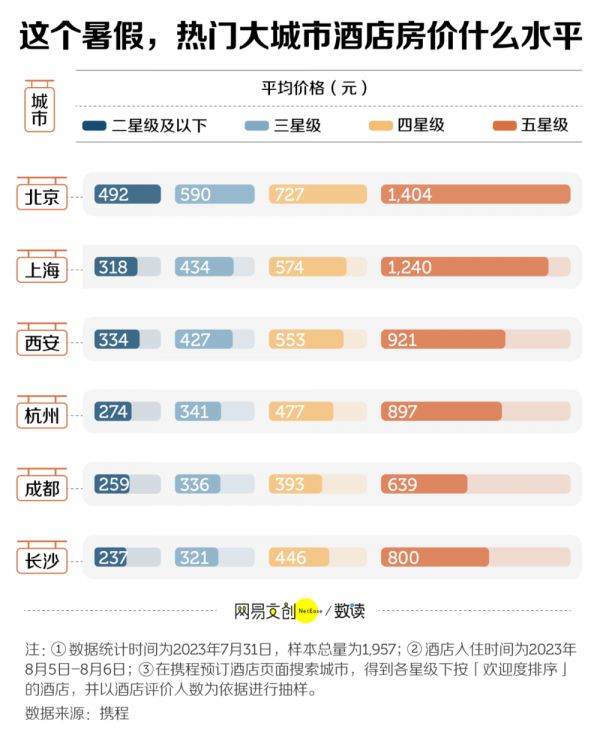 我们对上述热门城市的不同星级酒店的价格进行了统计,试图了解在暑期和周末双重因素影响下住宿的真实价格。