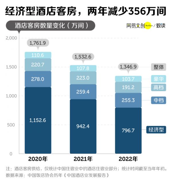 据中国饭店协会历年发布的《中国酒店业发展报告》,2022 年初中国大陆地区客房总数 1346.9 万间,对比 2020 年初,两年时间减少 415 万间客房,房间供应消失了近四分之一。