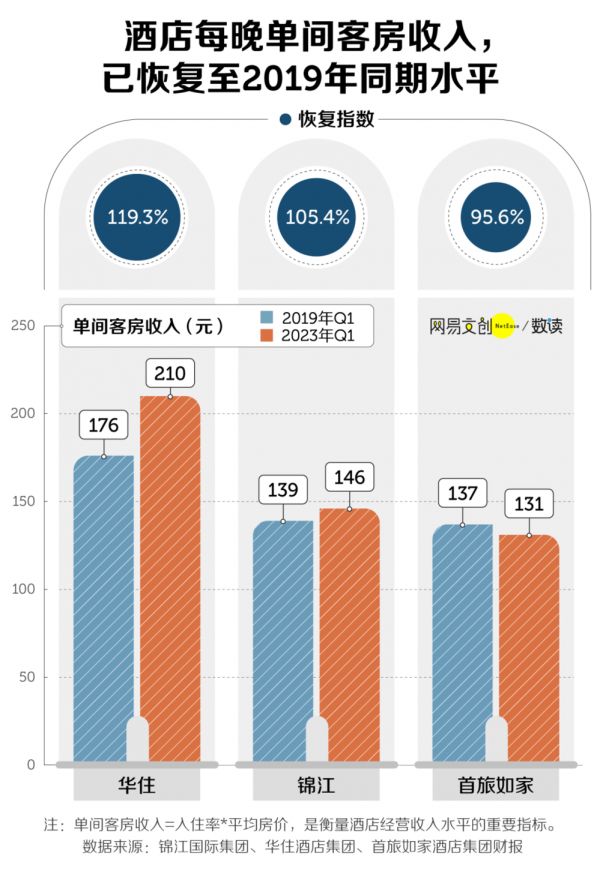 华住、锦江、首旅如家 2023 年一季度的财报纷纷显示,在酒店客房入住率还未达到 2019 年水平的前提下,其每晚的单间客房收入已分别恢复至 2019 年同期的 119.3%、105.4% 和 95.6% [11][12][13]。